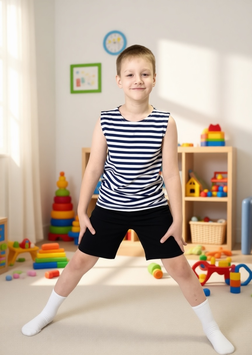 Майка-тельняшка, 100% хлопок. Тельняшка изготавливается из кулирного трикотажного. Полоска вывязанная, не печатная. Тельняшка свободно сидит, не сковывает движений. Прекрасно подойдет как мальчикам, так и девочкам. Отлично подходят для повседневной носки.